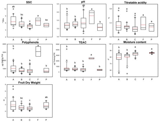 Box plot of biochemical parameters. Twenty-fifth percentile, median, 75th percentile, and range minimum-maximum. Outliers (white circle) were identified as 1.5 times the interquartile range. Red dashed lines represent the mean. Different letters indicate significant differences at p < 0.05. A = C. annuum, B = C. baccatum, C = C. chinense, F = C. frutescens, P = C. pubescens. Note that C. frutescens is not represented for moisture content and fruit dry weigh (FDW) because sufficient fruits were not available for the calculation of those parameters.