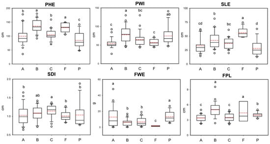 Box plot of conventional descriptors. Twenty-fifth percentile, median, 75th percentile, and range minimum-maximum. Outliers (white circle) were identified as 1.5 times the interquartile range. Red dashed lines represent the mean. Different letters indicate significant differences at p < 0.05. A = C. annuum, B = C. baccatum, C = C. chinense, F = C. frutescens, P = C. pubescens.