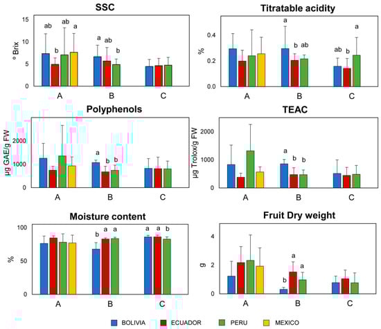 Bar plots of biochemical parameters expressed per country for C. annuum, C. baccatum, and C. chinense. Different letters indicate significant differences at p < 0.05. The absence of letters indicates non-significant differences. Only those parameters showing significant differences among countries are represented. Note that C. pubescens was not considered in the figure because significant differences were not observed among countries. A = C. annuum, B = C. baccatum, C = C. chinense.
