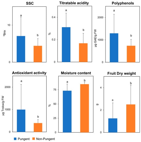 All biochemical traits, except for pH, significantly differed among pungent and non-pungent peppers. Putative hot berries possessed greater values for SSC, titratable acidity, polyphenols and antioxidant capacity. However, sweet fruits displayed a higher moisture content and dry weight (Figure 4). Assessment of conventional attributes revealed that pungent types were significantly associated with taller plants and lighter fruits. For TA descriptors, highly significant differences (p < 0.001) were observed for 20 parameters and significant differences at p > 0.05 were recorded for 11 traits. On average, pungent peppers had smaller fruits, with thinner pericarps and more roundish shapes (Table 2). Broader variability, expressed as coefficients of variation for each trait, was found within the pungent group. Similarly, a greater variation in CIELab coordinates was evidenced in potentially hot peppers. Significant differences were found for AaV, average hue (AHue) and AChV, suggesting that sweet accessions possessed slightly more redness and brightness fruits (Table 2).