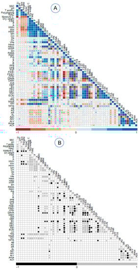 Pearson′s rank correlation coefficients between pairs of fruit traits. (A) Correlation coefficients for all pairs of traits. Positive and negative correlations are indicated according to the colored scale. The size of the squares is proportional to the correlation coefficients. (B) Correlation network for most significant traits (p < 0.05). Positive correlations are displayed in grey and negative correlations in black. The size of the circles is proportional to the correlation coefficients. SSC = soluble solid content, T. acidity = titratable acidity, TEAC = trolox equivalent antioxidant capacity, Moisture C = moisture content, FWE =fruit weight. Acronyms for TA parameters can be checked at Table S2.
