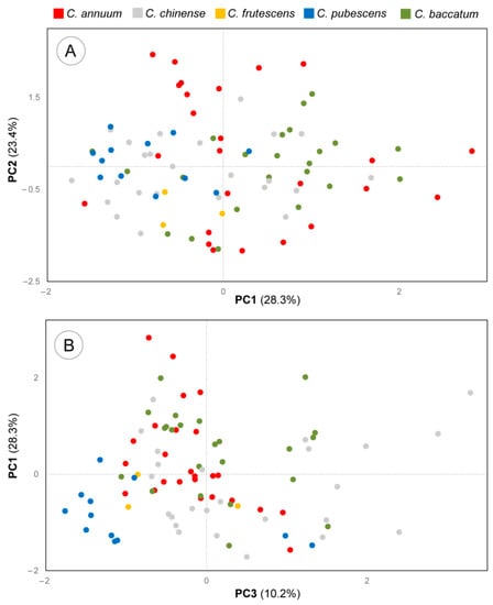 One hundred accessions depicting domesticated species and their ancestors were selected for this work: C. annuum (22), C. annuum var. glabriusculum (1), C. annuum wild (4), C. chinense (25), C. frutescens (12), C. pubescens (13), C. baccatum (4), C. baccatum var. pendulum (16), and C. baccatum var. baccatum (3). Forty-three were from Ecuador, 28 from Peru, and 18 from Bolivia. Eleven C. annuum accessions from Mexico were also included for comparative purposes (Table S1). Accessions were kindly provided by the USDA-ARS Plant Genetic Resources Conservation Unit (USA), the Institute for Conservation and Improvement of Valencian Agro-diversity (COMAV, Spain), the Centre for Genetic Resources (CGN, The Netherlands), and the Leibniz Institute of Plant Genetics and Crop Plant Research (IPK, Germany). The accession PM647 was kindly supplied by Dr. Alain Palloix (rest in peace) from the French National Institute for Agriculture, Food, and Environment (INRAE, France). When possible, they were selected to cover broad geographical regions within each country. Data on taxonomical classification and population type of each accession were extracted from genebanks databases. This collection was previously characterized for genetic diversity and molecular markers linked to disease resistance and pungency-related traits [,,]. C. annuum accessions from the collection were split into pungent and non-pungent fruits according to the results of marker MAP1, linked to the Pun1 gene [], as previously described [].