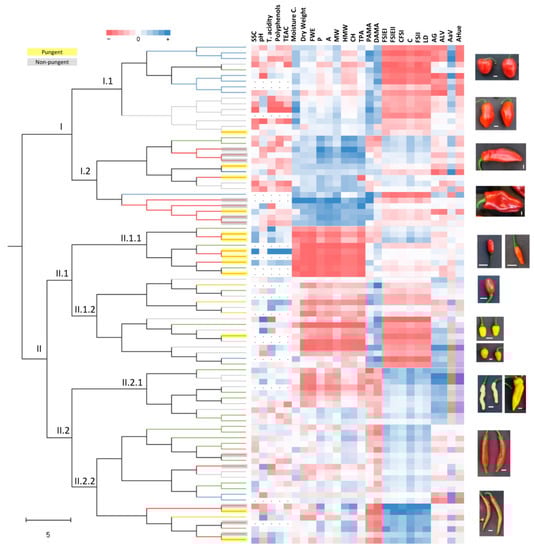 Groups of promising accessions possesing interesting traits were identified with an hierarchical cluster analysis by making use of those parameters highly contributing to the PCA variance. Clustering pattern was independent of Capsicum spp. or geographical origin and was primarily based upon fruit morphology, color and biochemical content (Figure 7). Two main groups (I and II) were differentiated. The first one (I) comprised accessions with bigger and heavier fruits, possessing high moisture content but low values for the biochemical parameters. The fruit shapes varied from nearly round (pear-like shape) to triangular or slightly elongated. The sub-group I.1 consisted of C. pubescens fruits with manzano type morphology showing an intense red color with low lightness, and C. chinense fruits of the habanero type (Figure 7). The sub-group I.2 harbour those fruits with the highest sizes and weights, primarily represented by C. annuum accessions. The subdivision of group II allowed to establish two subgroups, which could be additionally partitioned. Hence, the subgroup II.1.1 clustered C. annuum and C. baccatum wild accessions with the smallest fruits and lowest amounts of water. Interestingly, that group possessed high values for the majority of biochemical components (Figure 7). Subgroup II.1.2, which included primarily C. chinense and C. frutescens, also grouped small fruits, but with higher moisture content than II.1.1 and more roundish shapes. Yellow peppers of small size and roundish shapes conformed a subgroup within II.1.2. The remaining yellow fruits, mostly C. chinense and C. baccatum, were included into the sub-group II.2.1, since they showed more elongated morphologies. Sub-group II.2.2 comprised medium-size peppers of elongated forms. It is remarkable within that group the presence of various accessions with the highest fruit shape indices, which measured the ratio of height to width. Pungent C. annuum were included into the group II.1.1, whereas the majority of non-pungent accessions were circumscribed to groups I.2 and II.2.2 (Figure 7).