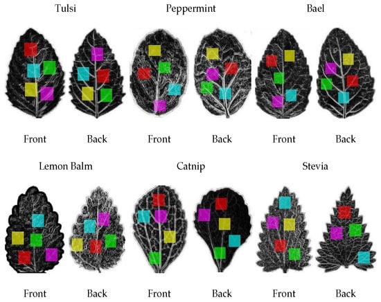 After that, we crop exactly the leaf region with (800 × 800) resolution, all the digital color images being transformed into the 8-bit gray-level format, and draw five regions of observation (ROO’s) on each sample image. The procedure of taking ROOs is divided into two steps; the first step, we take the size of ROOs is (220 × 220) and, in the second step, we take the size of ROOs is (280 × 280) and finally get the different datasets for experimentations. A total of 1000 (5 × 200) ROO’s have been generated for each medicinal plant leaf as represented in Figure 4. In this manner, a total of 6000 (6 × 1000) ROO’s has been generated on 6 varieties of medical plant leaves.