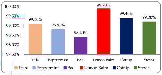 The distinct classification accuracy of six medicinal plant leaves, named as Tulsi, Peppermint, Bael, Lemon balm, Catnip, and Stevia, were 99.10%, 99.80%, 98.40%, 99.90%, 99.40%, and 99.20%, respectively, on ROO’s size 280 × 280 as shown in Figure 10.