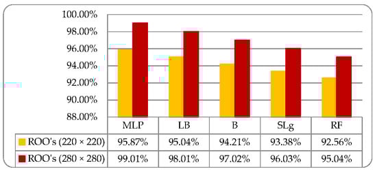 It is observed that MLP effectively emphasizes the other classifiers when the size of ROO is 280 × 280, as shown in Figure 9.