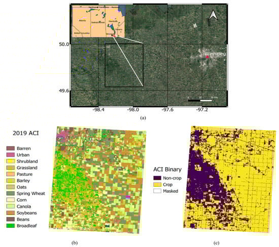 (a) The heterogeneous agricultural study area located near Carman, Manitoba, Canada (black box); (b) dominant land cover types include annual and perennial crops, with small towns and limited forest and shrub covers; (c) binary classification as crop and non-crop according to the Agriculture and Agri-Food Canada (AAFC) Annual Crop Inventory.