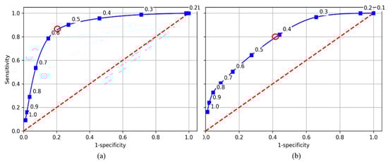Receiver operating curves (ROCs) for (a) Sentinel-1 and (b) PALSAR-2 based classifications. The marked points indicate the Sensitivity and 1-Specificity obtained when using a given CVthr value. The dashed line is the line of no discrimination. Red circles indicate the CVthr value yielding the best J-statistic values.