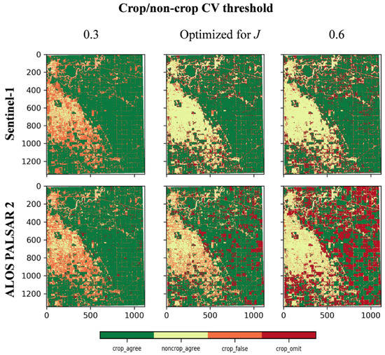 The middle panel of Figure 4 also shows that the J-optimized CVthr values yield balanced values between FP and FN: 13% and 14% for PALSAR-2 and 7% and 8% for Sentinel, respectively. At lower CVthr values (e.g., CVthr ≤ 0.3), the vast majority of errors stem from classifying non-crop as crop for both platforms (Figure 4). At higher CVthr values (e.g., CVthr ≥ 0.6), crop omission errors increase, with those for PALSAR-2 (34%) data being substantially greater compared to Sentinel-1 (15%). As indicated in Section 4.1, for PALSAR-2 to accurately detect the top right corner as crop, CVthr values would have to be so low as to produce false crop detections over the non-crop areas in the left portion of the image (CVthr = 0.3), and vice versa (CVthr = 0.6).