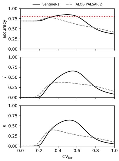 Plots of accuracy, J and κ versus CVthr show that these metrics varied more with CVthr values for the Sentinel-1 data than for PALSAR-2 (Figure 5). These metrics also had greater values for nearly every CVthr value for Sentinel-1 data. While the PALSAR-2-based classifications never exceeded a desired accuracy of 80%, it reached 77.4% using a CVthr = 0.31. The Sentinel-based classifications performed close to or above 80% for a wide range of CVthr values, approximately between 0.3 to 0.65. This is nearly twice the range noted in a comparable study, but using L-band data over an agricultural site in Mississippi [16].