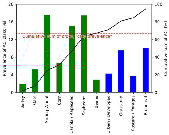 Plot of the prevalence of each ACI land cover class, colored by crop (green) and non-crop (blue). Because only ACI land cover classes covering more than 2% of the valid pixels are considered, we indicate the respective crop prevalence (horizontal line) and cumulative sum. The figure shows that the analysis can be reduced to 11 ACI land cover classes while still representing nearly all pixels (95%).