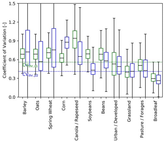 Figure 7 shows several notable features: (1) PALSAR-2 data have a much larger range of values (size of the box) for the relatively higher biomass crops than Sentinel-1 (barley, oats, spring wheat and canola); and (2) irrespective of whether C-band or L-band data are used, crop and non-crop classification appears to be robust for most ACI classes, except for soybeans and most of the non-crop classes (minus broadleaf). In all but these cases, the Q1 or Q3 values fell above/below the respective PALSAR-2 and Sentinel-1 CVthr values. For grassland, the Sentinel-1 Q3 value fell well below the CVthr,s1 threshold, whereas the PALSAR-2 median CV value for this class corresponded to CVthr,p2. The same was true for pastures, but with Sentinel-1 Q3 slightly extending above CVthr,s1. For urban, the median Sentinel-1 CV value was just beneath CVthr,s1, while nearly all of the box was above CVthr,p2—indicating that urban would classify better as a crop rather than non-crop for PALSAR-2. Figure 7 also shows interesting features over canola and corn: (1) for corn, PALSAR-2 had a much greater median CV value than CVthr,p2 and also the Sentinel-1 CV median value; (2) for canola, Sentinel-1 had a much greater median CV value than CVthr,s1 and the PALSAR-2 CV median value.