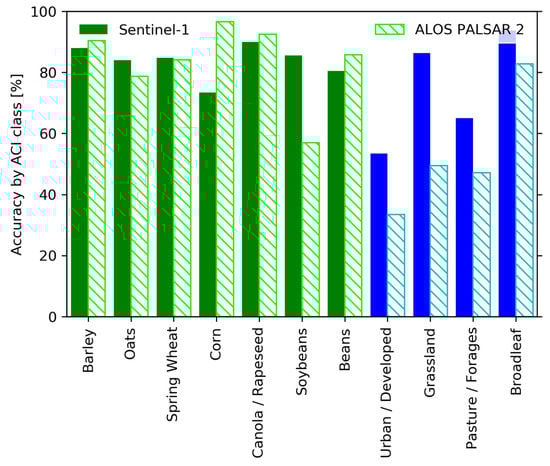 Bar graph showing the overall accuracy by ACI land cover class with prevalence >2% for the Sentinel-1 (solid bars) and PALSAR-2 (hatched bars) data.