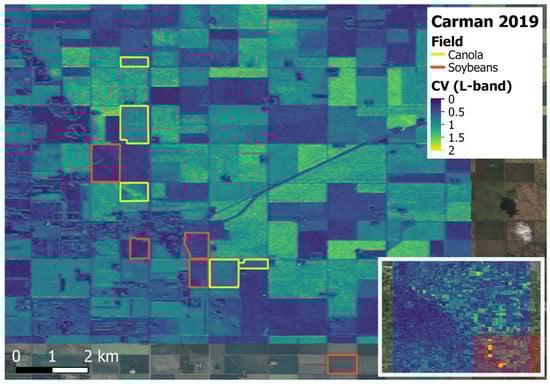 The PALSAR-2 data demonstrates greater field to field variation. Canopy structure (size, shape, and orientation of leaves, stalks, and fruit) varies vertically, and this structure is crop type specific. As such, a longer L-band wave is scattered deeper within the canopy architecture. In addition, L-band backscatter does not saturate until greater biomass accumulation relative to the C-band. Thus, saturation of the L-band signal may not be observed for lower biomass crops like soybeans even at the point of peak biomass. However, because changes in L-band backscatter for low biomass crops can be relatively smaller over time, the CV can also be small, potentially leading to misclassification as non-crop fields. For example, the northeast area of the Carman site is dominated by canola and soybeans (Figure 1b), and PALSAR-2 data shows small CV values (Figure 2b). Whereas Sentinel-1 data indicates greater CV values for both crops in this area, with CV values for canola greater than those of soybeans.