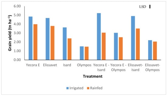 Under irrigated conditions, there were significant differences in grain yield among treatments (Figure 1). In particular, the mixture Isard-Yecora E had the highest grain yield (5.22 tn ha−1), followed by the mixture of Isard-Elissavet (4.89 tn ha−1), and the monocrops of both wheat cultivars. Among the pea monocrops, Isard had the highest grain yield, while both wheat cultivars had similar grain yields. On the other hand, Olympos and its mixtures with each of wheat cultivars have the lowest yields. Under water stress conditions, the highest grain yield was found at the wheat monocrops and followed by the Elissavet-Isard mixture.