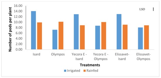 Number of pods per plant of monocrops of pea and its intercrops that there were used under Rainfed and Irrigated conditions. Data presented are mean values; vertical bar corresponds to the least significant difference (LSD).