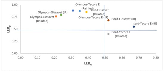 The total LER is used to determine the efficiency of intercropping for using the environmental resources compared with monocrops. In our study, there was a yield advantage of intercrops over monocrops as total LER was higher or equal to 1 for all intercrops. More specifically, the greatest LER in the cases of Elissavet-Isard (1.24) and Yecora E-Olympos (1.19) rainfed, as well as Yecora E-Isard (1.22), Yecora E-Olympos (1.22) and Elissavet-Isard (1.20) irrigated indicates that up to 19–24% more land area would be required of monocropping system to equal the yield of intercropping system [14,18,27]. These results suggest that intercropping remains beneficial, both under stressful and non-stressful contexts concerning moisture availability. In these cases, the significant yield advantage of intercrops over monocrops can be because of the better land utilization and the better use of the environmental resources for plant growth because of their better arrangement [14,40]. Similarly, intercropping advantages were reported in mixtures with different grain legumes such as common vetch, faba bean, and pea and different winter cereals [13,30,40]. On the other hand, in both Elissavet-Olympos intercrops and in Yecora E-Isard rainfed the LER values were close to unit, which indicates that there was no yield advantage or disadvantage over monocrops [13,14].