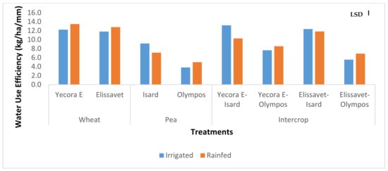 In most cases, the WUE was not significantly affected by the irrigation, with the exceptions at the Isard monocrop and Yecora E-Isard intercrop as they were higher by 22 and 28%, respectively, at the irrigated treatment compared with the rainfed treatments (Figure 5). In addition, WUE was higher in wheat cultivars as compared to pea cultivars, whereas pea Olympos had the lowest WUE.