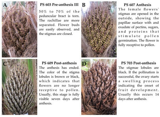 The research was carried out in plantations located in the central oil palm growing region of Colombia. The average temperature is 26 °C and the average annual rainfall is 2200 mm/year. Five- and six-year-old interspecific OxG hybrids, cultivar “Coari x La Me” obtained from the cross of E. oleifera ecotype Coari (Brazil) and E. guineensis from La Mé station (Ivory Coast) were used. At this age, the characteristics of floral development and fruit growth have been stabilized [7]. The palms had been planted at a density of 115 palms per hectare (experiments 1 and 2) or 128 palms per hectare (experiment 3). The treatments were applied to inflorescences in specific phenological stages (Figure 1) according to the BBCH (“Biologische Bundesanstalt, Bundessortenamt and CHemische Industrie”) phenology scale [7].