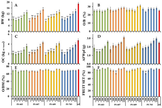 Effect of single applications of different NAA concentrations on the bunch components in OxG hybrids (Coari x La Mé). The NAA solutions were applied once at different phenological stages (PS) (603, 607, 609, 703), represented by the different colors. Assisted pollination treatment was performed only in inflorescences in anthesis (phenological stage 607), represented by the red bar. (A) Average bunch weight (BW). (B) Oil to bunch (O/B). (C) Oil content per bunch (OC). (D) Average fruit weight of parthenocarpic fruits (AFWpf). (E) Oil to dry mesocarp (O/DM). (F) Fruit set. Statistically significant differences between assisted pollination (AP) as commercial control and the NAA treatments across dosages/PS are indicated by asterisks (One-Way ANOVA, Dunnett’s test, * = p < 0.05, ** = p < 0.01).
