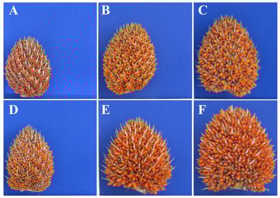 Bunches formed by 600 mg L−1 or 1200 mg L−1 NAA applications in OxG hybrids (Coari x La Mé). Bunch conformation improved with multiple hormone applications. Bunches were composed only of oily parthenocarpic fruits. The pictures are from representative bunches selected from treatments started at different phenological stages. (A) A dose of 600 mg L−1 NAA applied once. (B) A dose of 600 mg L−1 NAA applied twice. (C) A dose of 600 mg L−1 NAA applied three times. (D) A dose of 1200 mg L−1 NAA applied once. (E) A dose of 1200 mg L−1 NAA applied twice. (F) A dose of 1200 mg L−1 NAA applied three times.