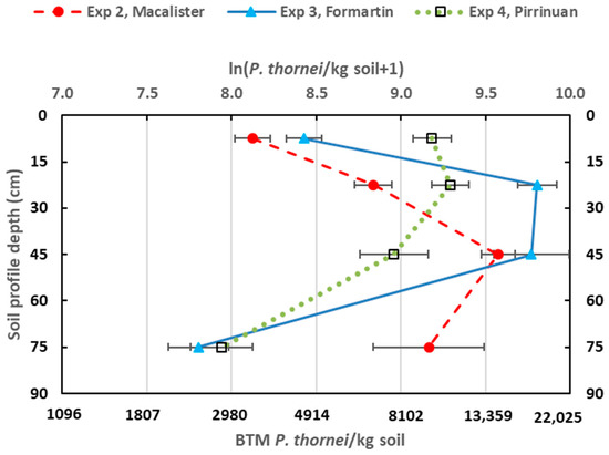 Population densities of Pratylenchus thornei in the soil profile before sowing Experiments 2, 3 and 4. Means of ln (P. thornei/kg soil + 1) are plotted on the top X axis with back-transformed mean (BTM) values indicated on the bottom X axis. Bar markers are SEM.