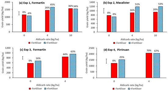 Effects of the nematicide aldicarb (0, 4 or 10 kg/ha) and fertiliser (0 or N120P30Zn15 kg/ha) on grain yield from (a) Experiment 1, (b) Experiment 2, (c) Experiment 3, and (d) Experiment 4. The 4 kg/ha rate of aldicarb was applied in the seed row and the 10 kg/ha rate was incorporated in the soil before sowing. Values above bars are percentage yield increase above control treatment without nematicide or fertiliser. Bar marker = l.s.d. (P = 0.05).