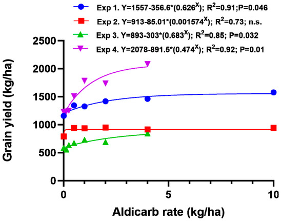 Asymptotic exponential equations effectively modelled the response in grain yield to rate of aldicarb applied without fertiliser in all four experiments (Figure 3). Grain yield was most responsive to rate of aldicarb in Experiment 4.