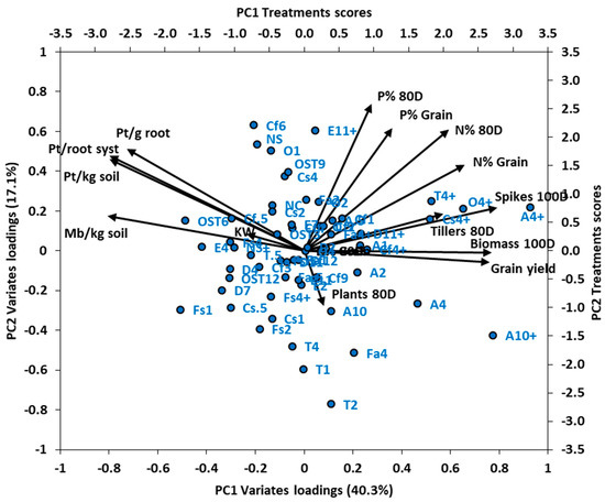 Experiment 2: Bi-plot of principal components axes PC1 and PC2, depicting vectors of loadings of 14 variates, and scores for 58 nematicide and fertiliser treatment combinations as points. Percentage of variance explained by PC1 and PC2 is given in parenthesis on respective axes. Variate names in black at end of vectors have abbreviations: Pt = Pratylenchus thornei, Mb = Merlinius brevidens, D = days after sowing, KW = kernel weight. Treatment names in blue alongside points have abbreviations NS = nil nematicide (seed box), NC = nil nematicide (cone), A = aldicarb, O = oxamyl, Cf = carbofuran, Cs = carbosulfan, Cl = cleothocarb, T = terbuphos, Fa = fenamiphos, Fs = fensulphothion, E = ethylene dibromide, D = 1,3-dichloropropene, OST = oxamyl seed treatment, CfST = carbofuran seed treatment, numbers = nematicide rate (kg/ha for most nematicides; L/ha for E and D, g/kg seed for OST and CFST), + indicates fertiliser (N120P30Zn15 kg/ha.