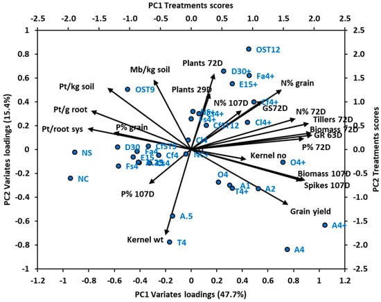 Principal components analysis (PCA) was conducted in Genstat [40] for Experiments 2 and 4 based on the individual treatment combinations and variates. Treatments for which no chemical analyses of plant material were available (that is, the lower rates of nematicides other than aldicarb) were not included in the principal components analysis for Experiment 4. The PCA was based on the correlation matrix between variates. Results were displayed as a bi-plot with treatment scores and variate loadings both standardised by the latent roots for the first two principal components, respectively.
