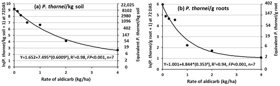 3.6. Depression of P. thornei Population Densities in the Root-Zone Soil and in the Roots at 72 DAS in Response to Aldicarb Rate in Experiment 4