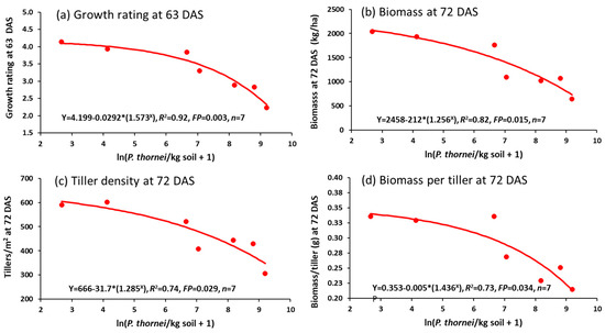 Relationships between wheat growth variables of (a) growth rating at 63 DAS, (b) biomass at 72 DAS, (c) number of tillers/m2 at 72 DAS or (d) biomass per tiller, and explanatory variable ln(Pratylenchus thornei/kg root-zone soil at 72 DAS in Experiment 4.