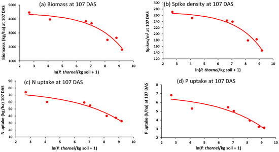 Relationships between wheat growth or nutrient variables at 107 DAS, namely, (a) biomass, (b) number of spikes/m2, (c) N uptake or (d) P uptake, and explanatory variable ln(Pratylenchus thornei/kg root-zone soil at 72 DAS in Experiment 4.