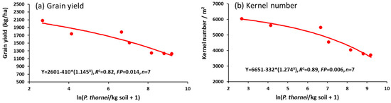 Relationships between wheat grain variables (a) grain yield, or (b) kernel number/m2, and explanatory variable ln(Pratylenchus thornei/kg root-zone soil) at 72 DAS in Experiment 4.