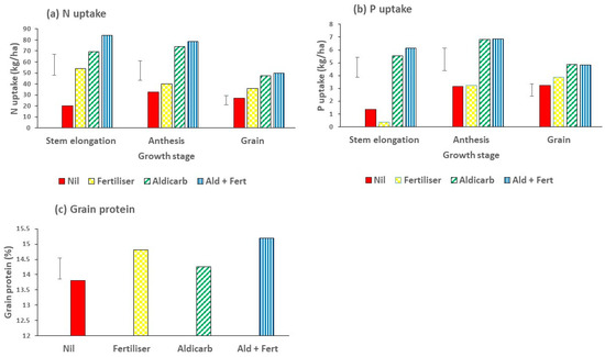 Effects of the nematicide aldicarb (4 kg/ha) and fertiliser (N120P30Zn15 kg/ha) on (a) N uptake and (b) P uptake at different stages of wheat growth, namely stem elongation (Z32), anthesis (Z65) and ripened grain (Z92); and (c) grain protein in Experiment 4. Bar marker = l.s.d. (P = 0.05).