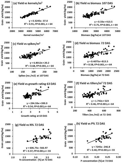 Across all 64 treatments, there were highly significant linear relationships between grain yield and number of kernels/m2 (Figure 12a) and biomass at 107 DAS (Figure 12b) in particular, then number of spikes/m2 at 107 DAS (Figure 12c), biomass at 72 DAS (Figure 12d), growth rating at 63 DAS (Figure 12e) and number of tillers/m2 at 72 DAS (Figure 12f). For a selected set of 33 treatments that were analysed chemically, there were highly significant relationships between grain yield and N and P concentrations at 72 DAS (Figure 12g,h).