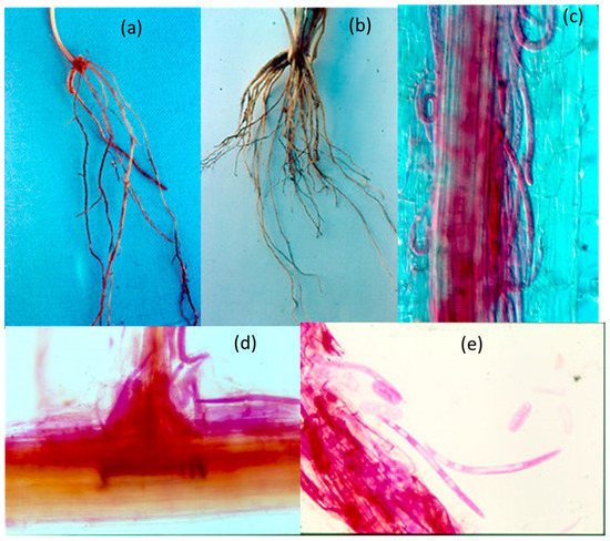 Dark lesions due to P. thornei were present on both the seminal roots and crown roots of field-grown wheat cv. Gatcher (Figure 13a,b). In stained young roots under the microscope, P. thornei was visible in clusters in the inner cortex aligned parallel with the root axis (Figure 13c). Brown-pigmented lesioned areas also had many P. thornei vermiform life stages and eggs in the roots, and these areas also exhibited sloughed off epidermis and severely damaged cortex (Figure 13d). Under slight pressure on the coverslip of the slide, nematodes and eggs streamed out of the damaged roots (Figure 13e).