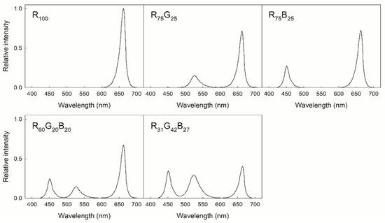 Spectral distributions of the five light quality treatments delivered by red [R (600–700 nm), peak = 664 nm], green [G (485–600 nm), peak = 524 nm], and blue [B (400–485 nm), peak = 451 nm] light-emitting diodes. The numbers after each waveband indicate the ratios of the intensities. The R31G42B27 treatment mimics the sunlight spectrum measured in the experimental greenhouse.