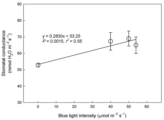 Correlation of the stomatal conductance of Ocimum basilicum with irradiated blue light intensity. Plants were grown under five different combinations of red, green, and blue LEDs with the same light intensity for 14 days. Values are the means of three or six replicates. Error bars indicate the standard error.