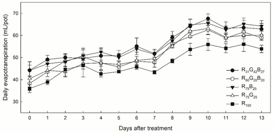 The daily evapotranspiration of sweet basil was measured using load cells for two weeks, and the measured values are shown in Figure 5. The daily evapotranspiration of the plants gradually increased as they grew, regardless of the treatments. Overall, the amount of daily evapotranspiration was higher in the R75B25, R60G20B20, R31G42B27, and R75G25 treatments than in the R100 treatment. A difference in evapotranspiration amount among the treatments was detected at 1DAT (p = 0.0159) (Figure 5). Although plant size is the most important factor that determines the water use of plants [40], there was no significant difference in plant size among the treatments in the present study (Table 1). Therefore, the water use of the plants was mostly influenced by the extent of the stomatal aperture at the beginning of the experiment, which is an immediate response of plants to light quality. Rapid changes in stomatal opening under different light qualities have been reported in a previous study [20].