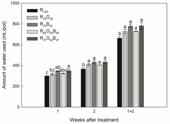 A difference in water use between the R100 treatment and the other treatments, which contained green or blue light, was observed and became more evident in the second week than in the first week (Figure 5 and Figure 6). During the first week, the amount of water used by the R100 and R75G25 treatments was significantly lower than that in the R31G42B27 treatment (Figure 6). However, during the second week, water use in the R75G25 treatment caught up with that in the R31G42B27 treatment, and only the R100 treatment displayed a smaller amount of water use than the other treatments. This was because green light increased the stomatal conductance of plants compared to red light, playing a similar role to that of blue light in the R75G25 treatment. Therefore, the total amount of water used by the plants was higher in the R75G25, R75B25, R60G20B20, and R31G42B27 treatments than in the R100 treatment (663.5, 726.5, 728.7, 778.0, and 782.1 mL of water per pot for the R100, R75G25, R60G20B20, R75B25, and R31G42B27 treatments, respectively), during the entire experimental period. The difference between the highest and lowest amounts was 118.6 mL. Our results showed that the stomatal response of plants led to different water usage by the plants depending on the quality of the irradiated light.