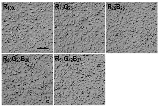 Effects of different spectral treatments on the stomatal development of Ocimum basilicum grown under five different combinations of red, green, and blue LEDs with the same light intensity for 14 days. The numbers after each waveband indicate the ratios of the intensities. The R31G42B27 treatment mimics the sunlight spectrum measured in the experimental greenhouse. Scale bar is 100 µm.
