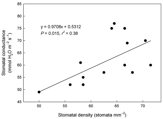 Relationship between the stomatal conductance and stomatal density of Ocimum basilicum. Plants were grown under five different combinations of red, green, and blue LEDs with the same light intensity for 14 days. The regression line was fitted through the data of all the treatments.