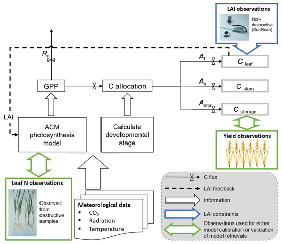 where yield is dependent on the interception and absorption of solar radiation (i.e., climate) by available leaf area (i.e., LAI) and its carboxylation capacity (i.e., leaf N). Essential climate drivers include solar energy, required for photosynthetic reactions, and temperature, which effects the rates of crop development and photosynthesis. Prior to harvest the best proxy for yield is LAI, which is the largest biomass pool and the most readily observable, with many LAI products generated from satellite data. Research has also demonstrated improved crop model yield simulations when assimilating LAI observations [32,33,34]. Thus, the LAI at a time t should be explained by the chronological development of LAI and leaf N, along with the climate during the preceding period. Since LAI is only one component of the yield equation, its growth must also be consistent with the evolution of the crop’s developmental stage up to time t: