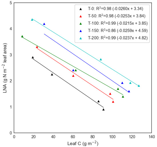 Analysis of leaf nitrogen per leaf area (LNA) against C leaf (leaf C per ground area) based on destructive sample analysis at each of the N treatment plots (T−0 to T−200 kg N ha−1) during the 2018 wheat growing season. Derived linear regression coefficients were used within the DALEC-Crop model to calculate LNA. Note: Each LNA—Leaf C point is derived from the mean of two replicated destructive samples.