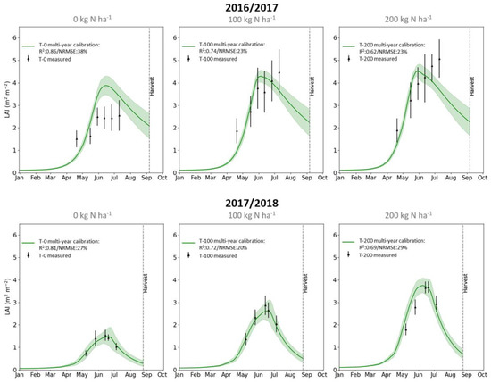 The DALEC-Crop cross-treatment and multi-year calibrations for each N treatment had a high agreement with all the LAI observations—the mean R2 was 0.78 and mean NRMSE was 26% (Figure 4 and Table 3). Most of the observations were within the model uncertainty. The later LAI observations in the first season (i.e., 26 June and 10 July 2017) were generally not as well captured when compared to the earlier measurements, this was particularly the case for the higher treatments (i.e., >100 kg N ha−1). For all treatments, the performance of the calibration for the simulation of LAI in the first season (mean R2 = 0.73 and NRMSE = 27%) was slightly lower than that of the second season (mean R2 = 0.83 and NRMSE = 25%).