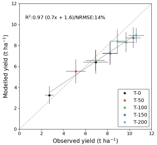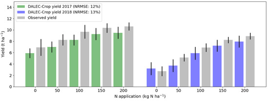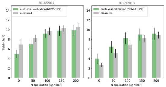 For the first growing season the mean NRMSE of yield prediction was 12% and for the second season it was 13%. This model performance for yield was, therefore, comparable to the results in the model calibration stage, during which leaf N information was provided (Figure 5).