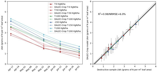 A total of 25 of the DALEC-Crop parameters determining C availability and phenology were calibrated for each treatment (see Supplementary Material, Table S1). This calibration was based on optimizing the selection of these parameters such that the DALEC-Crop mean LAI and yield estimates were within a 12% uncertainty of the observed at each of the corresponding calibration plots. This uncertainty for LAI was previously quantified in Revill et al. [11] and, in this analysis, we assume this characterized uncertainty to be the same as that of the yield observations. Throughout this calibration the LNA used in the ACM PNUE equation (3) was calculated by providing DALEC-Crop with the slope and intercept of the linear N dilution fit derived from the destructive sample data for a given treatment (Figure 3).