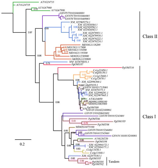 It is apparent that each of the four species (A. thaliana, V. vinifera, M. domestica and D. zibethinus) constituted the gene cluster respectively in the basal part of the ML tree (Figure 1), indicating that OMT gene family has undergone species-specific expansion during evolution. In Class I, the branches were made up of GSVIVT01020603001, GSVIVT01015243001, GSVIVT01015246001, GSVIVT01015245001, GSVIVT01015244001, PgOMT06, PgOMT05, PgOMT08, PgOMT04, PgOMT03, PgOMT01 and PgOMT02, which represented a ratio of 5:7 of grape to pomegranate (Figure 1). It was indicated that pomegranate experienced one WGD event after paleohexaploidy shared with V. vinifera and considerable fraction duplicates were lost during the subsequent gene loss event [,,,].