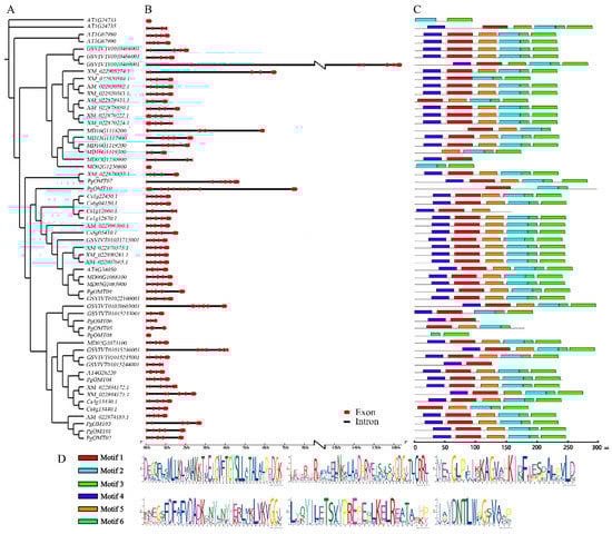 Phylogenetic tree (A), gene structures (B), conserved motif distribution (C) and 6 conserved motifs (D) of OMT gene from 6 species. Gene structures and protein conserved motifs were visualized by online software GSDS and MEME, respectively.